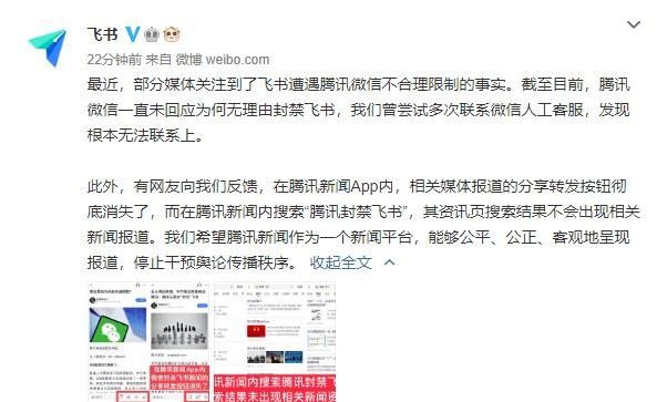 1月11日,飛書官方賬號發(fā)文表示,最近部分媒體關(guān)注到了飛書遭遇騰訊微信不合理限制的事實。錦州軟件開發(fā)截至目前,騰訊微信一直未回應(yīng)為何無理由封禁飛書,我們曾嘗試多次聯(lián)系微信人工客服,發(fā)現(xiàn)根本無法聯(lián)系上。此外,飛書也曬出了一些網(wǎng)友的反饋,在騰訊新聞APP內(nèi),相關(guān)媒體報道的分享轉(zhuǎn)發(fā)按鈕徹底消失了。在騰訊新聞內(nèi)搜索“騰訊封禁飛書”,其資訊頁搜索結(jié)果不會出現(xiàn)相關(guān)新聞報道。