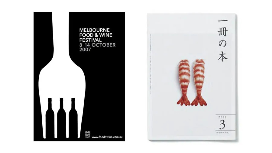 右邊的海報是日本大師原研哉的設(shè)計作品,大量的留白空間更加顯得中間壽司的精致,少而靜的視覺元素提升了作品的品質(zhì)感。