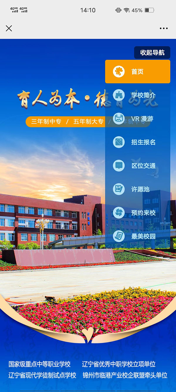 報名軟件功能分為學(xué)校簡介、VR學(xué)校全景云游導(dǎo)視、招生報名、一鍵導(dǎo)航區(qū)位交通、許愿池、預(yù)約來校、最美校園展示幾個功能版塊。